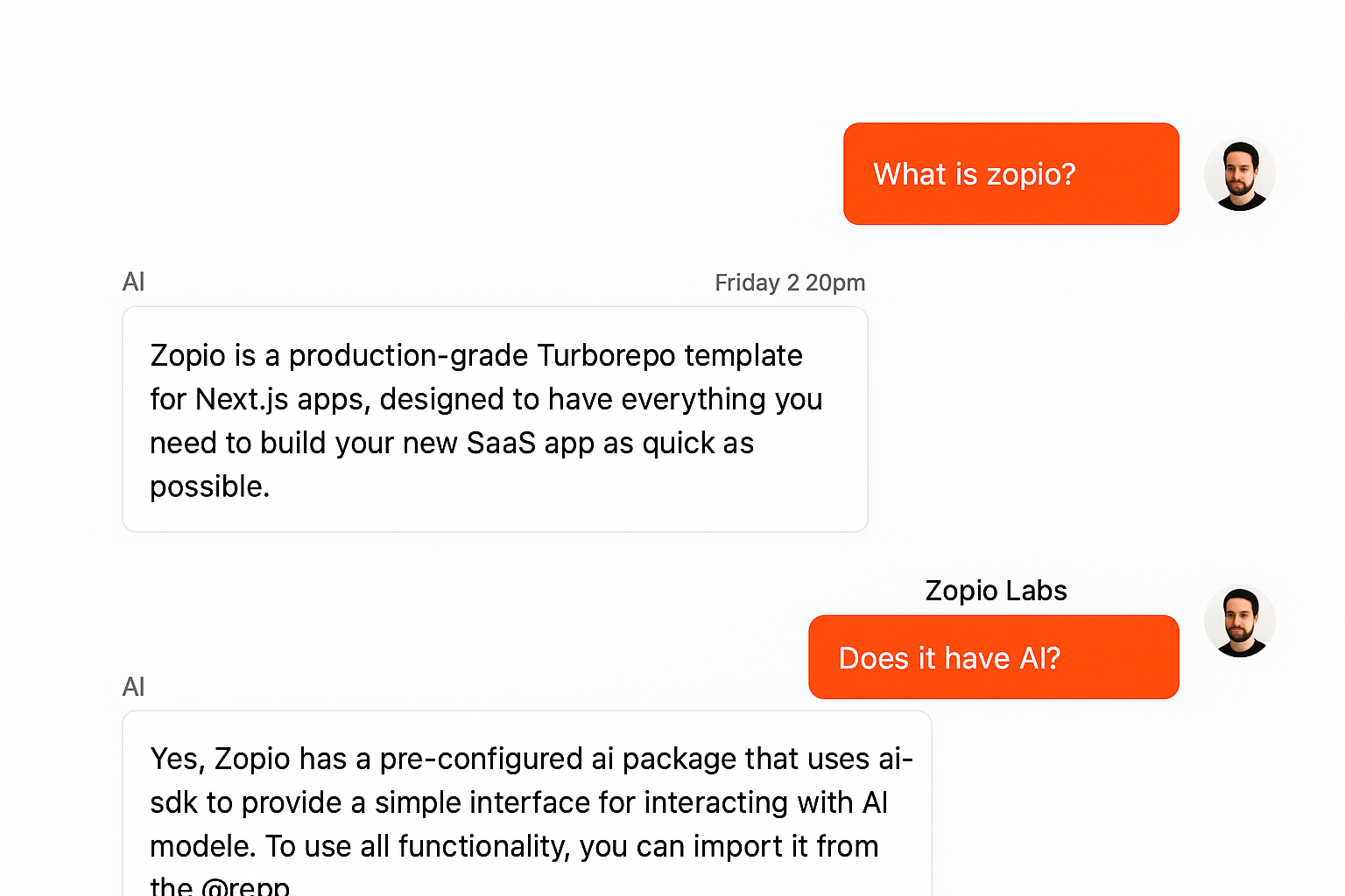 zopio has a pre-configured ai package that uses ai-sdk to provide a simple interface for interacting with AI models.
